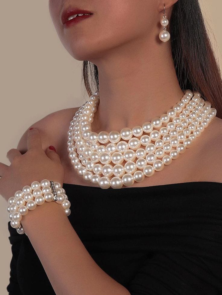 This pearl statement necklace epitomizes opulent elegance, boasting oversized pearls intricately woven into a striking collar design. This bold accessory exudes confidence and sophistication, instantly elevating any ensemble with its timeless charm. Whether for formal affairs or everyday chic, the pearl statement necklace is a captivating addition to any jewelry collection