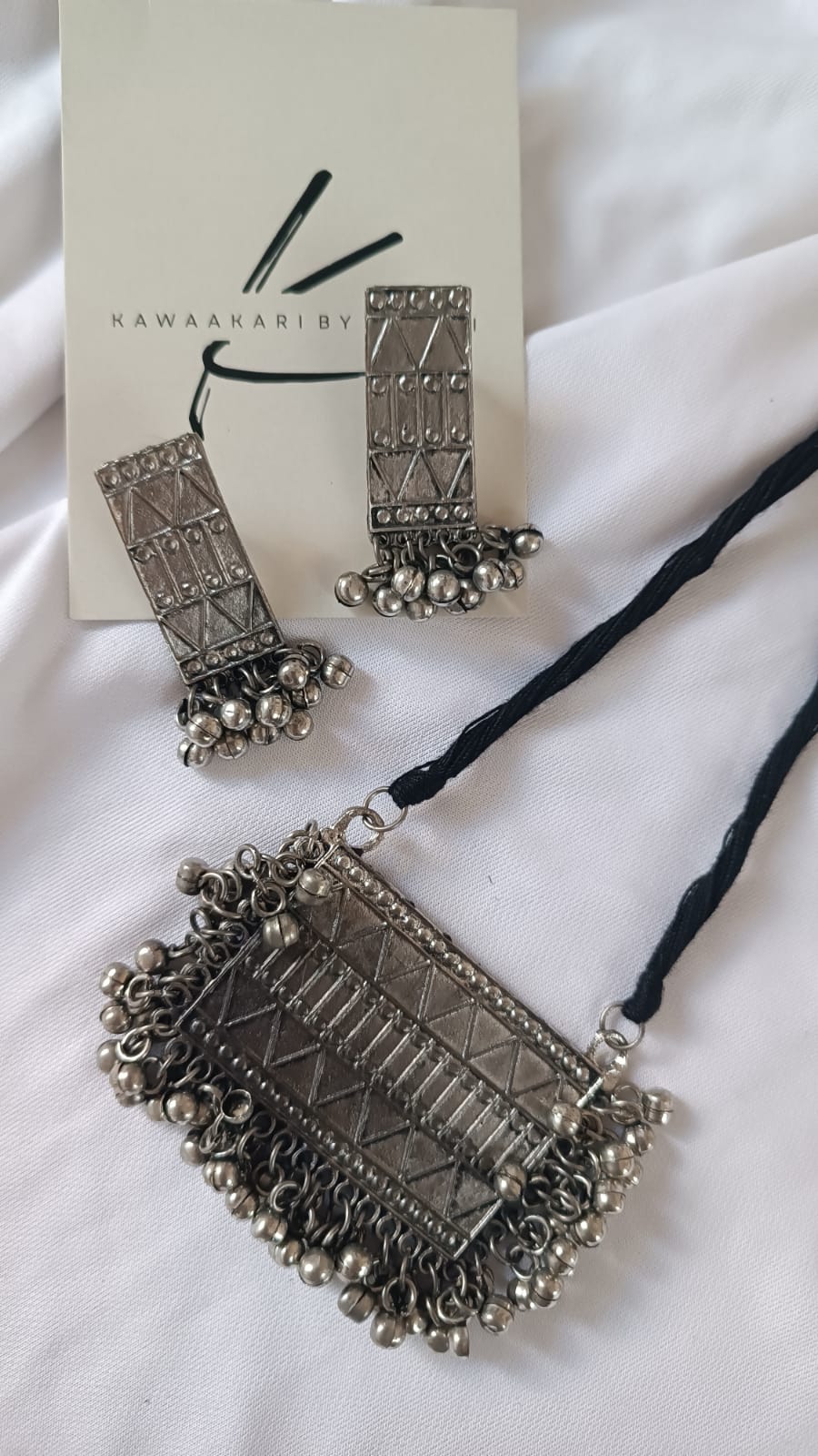 “Chic oxidized long necklace set exudes vintage charm. Intricate details and rustic finish make it a versatile statement piece for any ensemble.”
