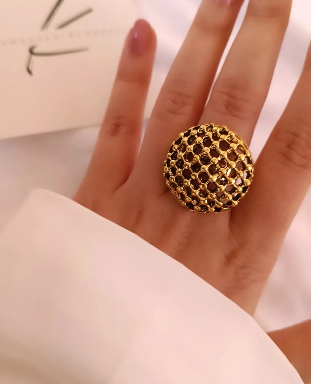 An antique gold statement ring, a relic of elegance, whispers tales of timeless allure, evoking a sense of grandeur and history.