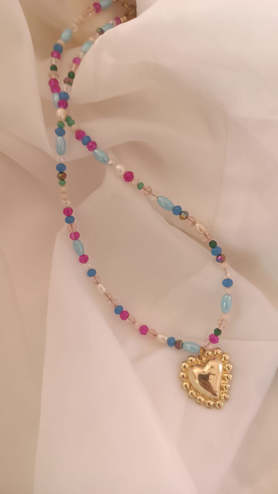 This vibrant multicolored beaded necklace features a charming heart-shaped pendant, adding a playful and elegant touch to any outfit. Perfect for casual wear or as a statement accessory.