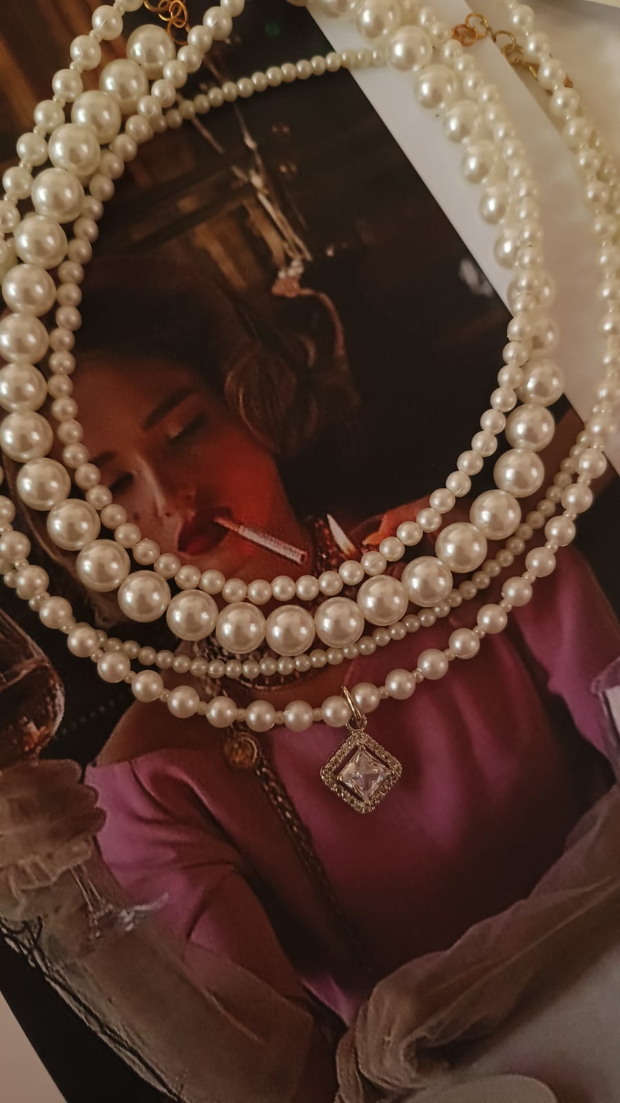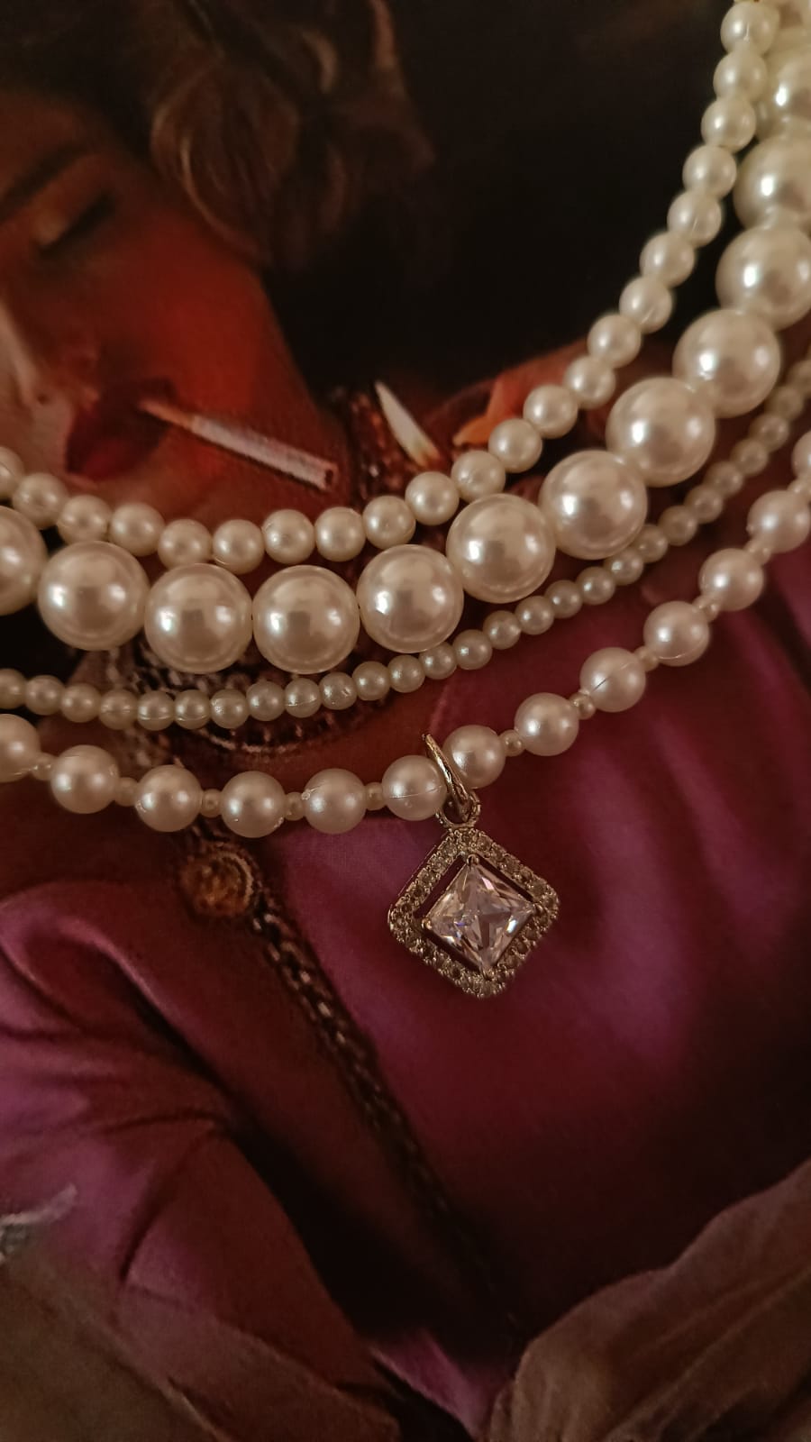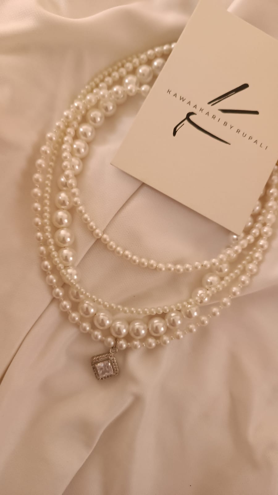Elevate your style with the exquisite Multi-Strand Pearl Necklace from Kawakari by Rupali. This stunning piece features a sophisticated arrangement of lustrous pearls, beautifully layered to create a timeless and elegant look. The necklace is adorned with a delicate square pendant, adding a touch of sparkle and sophistication.