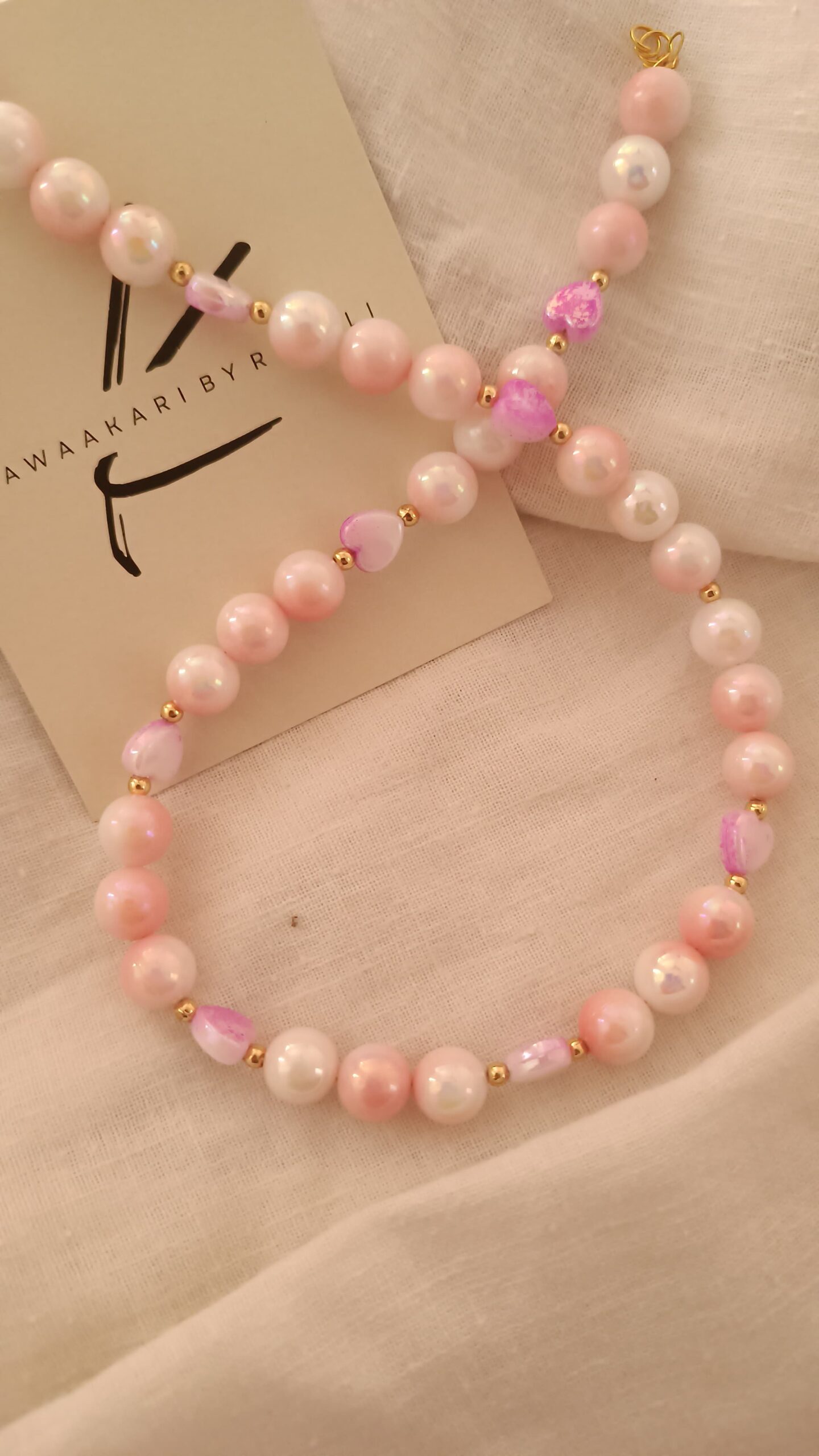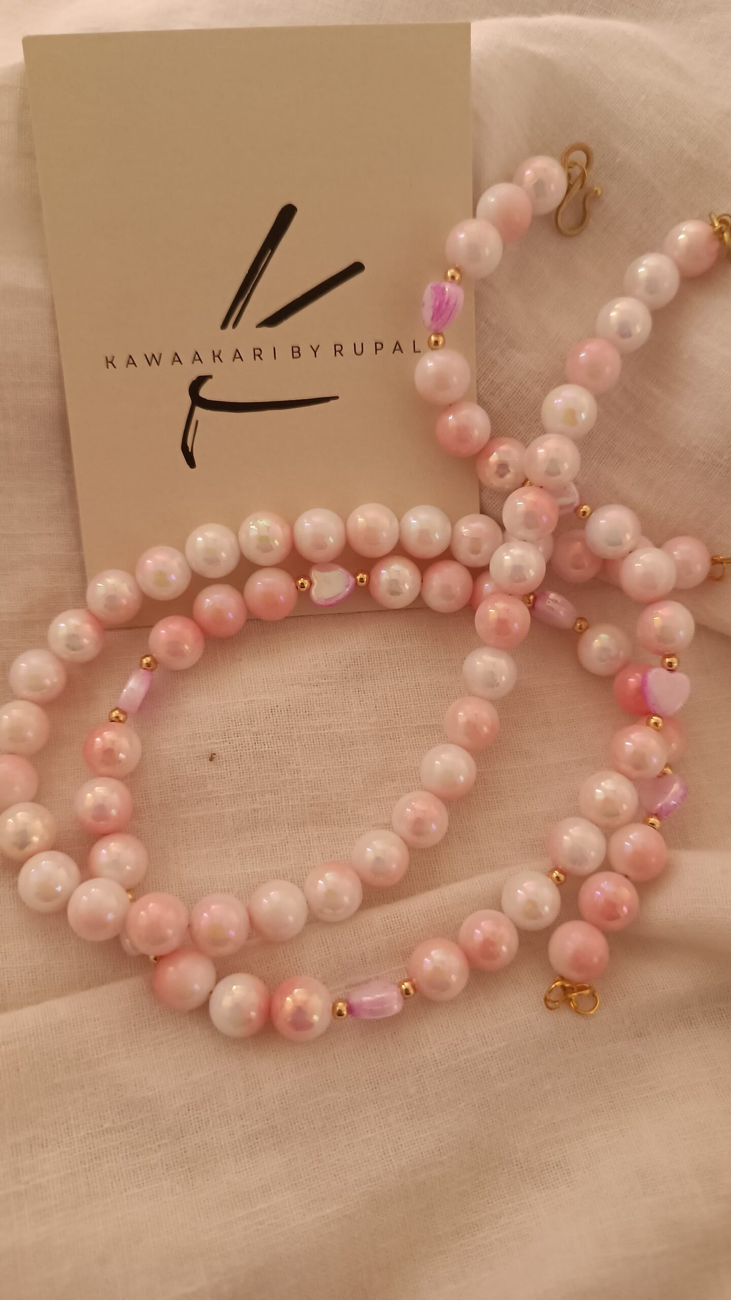 Set of 2 pink marble glossy bead necklace with heart deatialing in one.